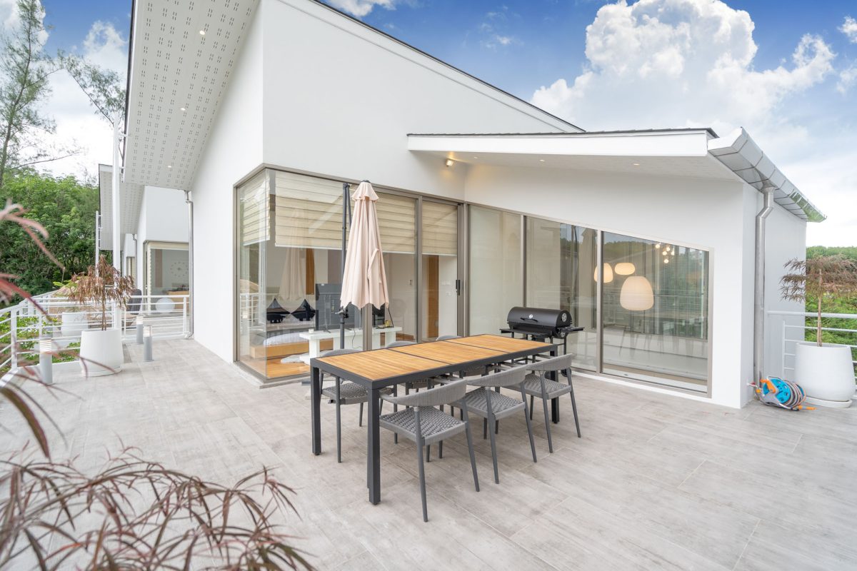 The downstairs lounge and first bedroom area open up onto the pool and garden, allowing you to sit back and relax on the sun loungers or outdoor table. The big balcony is accessible from the master bedroom and has an outdoor table and BBQ equipment, where you can host family or friends.